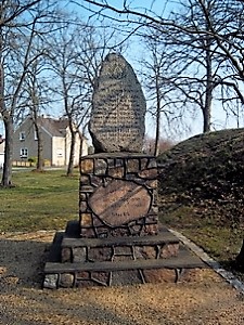 aus einem gemauerten Steinsockel mit obenauf einem behauenen Findling zur Erinnerung an die