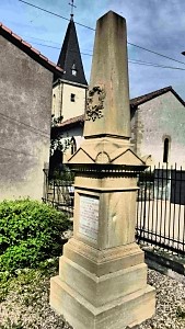 Kleine Kriegsgräberstätte mitten im Ort neben der Kirche. Zentraler Obelisk mit seitlichen Gräberfeldern