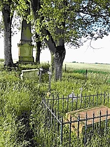 Denkmal für die Gefallenen des Infanterie Regiments Nr. 28 im Kriege 1870/71 nordöstlich von Gravelotte an einem Feldweg. Obelisk mit krönendem EK Zeichen, und daneben liegenden Einzelgräbern.