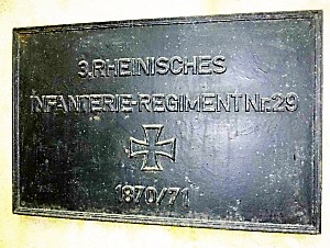 Rozérieulles (Denkmal Infanterie Regiment Nr. 29: 1870/71), Département Moselle, Lothringen, FrankreichPLZ 57160 Denkmal in einem Waldstück links der Strasse N 3 (Gravelotte-Rozérieulles) in der Nähe der Ferme Moscou. Über einem dreigestuften Sockel ein Pfeiler, der eine vierseitige, sich verjüngende Pyramide trägt. Die ursprünglichen Namenstafeln und der krönende Adler sowie anderer Zierrat sind verschwunden. Heute ist nur noch eine neue Metalltafel mit Inschrift vorhanden.