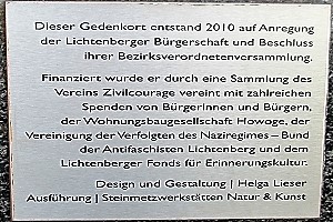 mit aufgesetzter Edelstahltafel mit den Namen der ermordeten Kommunisten. Links und rechts
