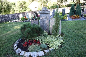 Im Friedhof runde Rabatte mit drei Steintafeln.