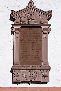 Sand (1870/71), Gemeinde Willstätt, Ortenaukreis, Baden-WürttembergPLZ 77731 Gedenktafel an der Außenwand der Pfarrkirche der evgl. Bartholomäusgemeinde in Sand. Das Epitaph aus rotem Naturstein trägt im Giebel plastische Darstellungen: Kaiserkrone, Helm, Waffen, militärisches Gerät. Unter den Zahlen 1870-1871 eine Inschrift und die Namen der Gefallenen, bzw. Kriegsteilnehmer. Im Sockel unter einer Inschrift ein weiteres Relief: Eisernes Kreuz im Ehrenkranz. Name des Bildhauers: Jogerst