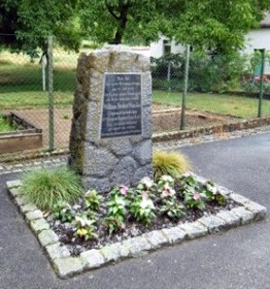 Ein grauer Natursteinblock an der Dorfstraße im Ortsteil Schirlenhof trägt eine polierte schwarze Tafel mit Inschrift, Name und Datum.