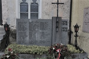 Bei der Kirche; marmorne Gedenkwand und Metallkreuz