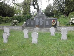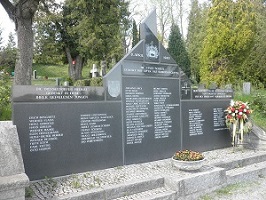 Großes dreiteiliges Denkmal auf dem Bergkirchen-Friedhof für Gefallene und Bombenopfer; davor