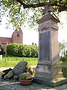 Denkmal für die Gefallenen des 1. Weltkriegs, Stele mit krönendem Eisernen Kreuz. Beigestellt ein Gedenkstein für die Opfer des 2. Weltkriegs (ohne Namen). Namen der Gefallenen des 2. Weltkriegs aus Archiven.