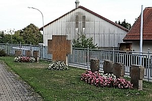 Bei der Kirche; mehrere Steinkreuze mit Namen; zusätzlich Hinweise zu Soldaten von privaten Gedenksteinen