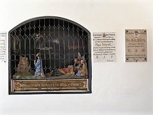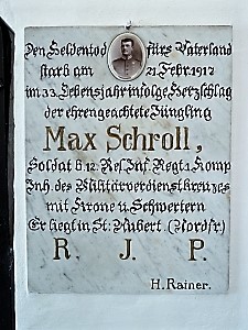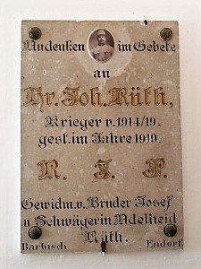 Dorfkirche St. Ägidius. Im Vorraum hängen Gedenktafeln mit Fotos und Daten von gefallenen Soldaten des Ersten Weltkriegs aus der Gemeinde. Dazu finden sich noch Namen auf privaten Gedenksteinen.