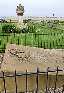 Grabplatte: Hier ruhen vom Grenadier Regiment Kronprinz 1. (Ostpreussischen) No. 1 Hermann von Arnim Hauptmann u. Compagniechef, Ritter des Eisernen Kreuzes geb. den 4. November 1830 verwundet den 31ten August 1870 gest. den 21 November 1870 Friedrich Hoernecke Premier Lieutenant geb. den 6. November 1841 gefallen 31ten August 1870 Bruno von Schau Second-Lieutenant Inhaber des Militair Ehrenzeichens II.ter Klasse geb. den 14. November 1842 gefallen 31ten August 1870 und der Bursche des letzteren Grenadier Johann Habermann der 2(nicht lesbar) Comp. geb. den 1. October 1846 gefallen 31ten August 1870 Sie starben den Heldentod fuer König und Vaterland