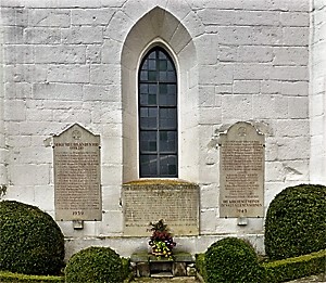 Gedenktafeln aus Stein an der Außenwand der evangelischen Kirche St. Peter.