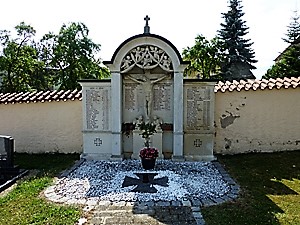 Gedächtnisstätte an der südlichen Friedhofsmauer, errichtet 1923. Säulenbogen aus Kunststein, überdacht, gekrönt von einem Kreuz. Im Bogenteil fünf Engel auf Rankenwerk. Auf einem in der Mitte gewölbten Podest zwei kniende Engel mit Girlande am Fuß eines Steinkreuzes mit Corpus Christi. 1972 wurden links und rechts zwei weitere Gedenktafeln f aus Juramarmor für den 2. Weltkrieg angebracht.
