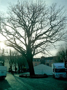 Friedenseiche auf dem Marktplatz mit zwei Gedenksteinen.