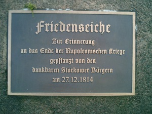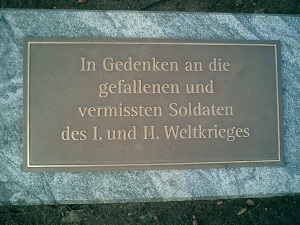 Die Tafel für die Opfer der beiden Weltkriege wurde erst 2018 unter die Friedenseiche gelegt. Da sie im Gegensatz zu der Tafel für die napoleonischen Kriege auf dem Boden hinter der Eiche liegt, ist sie hinter der den Baum umgebenden Sitzbank praktisch unsichtbar. Datum der Abschrift: 1.1.2019
