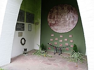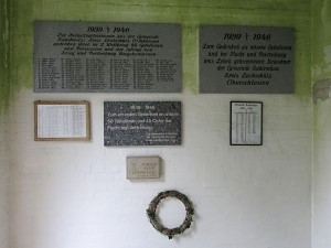 An der linken Wand sind mehrere Gedenktafeln angebracht, zwei davon für Tschirmkau. Eine große graue Granit-Gedenkplatte