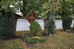 An zwei Stellen im Friedhof Kriegsgräber; a) Steinplatte am Boden (ohne Namen) b). drei überdachte Holzkreuze