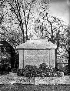 Muschelkalk in Marmor die Skulptur einer trauernden Mutter, die mit einer Hand den Stahlhelm ihres gefallenen Sohnes