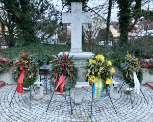 Denkmal bei der Aussegnungshalle im städtischen Friedhof an der Nelkenstraße. Ein großes Steinkreuz thront auf dem Quader mit Namen auf allen vier Seiten.