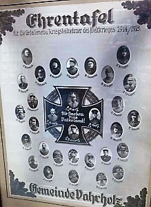 In Vahrholz gab es nie öffentliches Gedenken an die Gefallenen des 1. oder 2. Weltkriegs, weder ein Denkmal, noch Gedenktafeln in der Kirche. Nur für die Gefallenen des 1. Weltkriegs wurden privat Foto Ehrentafeln angefertigt. Dank an Herrn Lemme für die Erlaubnis so eine Ehrentafel zu fotografieren. Die Ehrenlisten für die Gefallenen des 1. Weltkriegs mussten die Bürgermeister aller Orte in Sachsen Anhalt für den Volksbund Deutsche Kriegsgräberfürsorge anlegen. Vom Altkreis Salzwedel sind diese Listen im Kreisarchiv erhalten. Dort wurde auch vermerkt ob Denkmäler oder Gedenktafeln vorhanden waren. Zu Vahrholz wurde dies nicht angegeben, Nur auf einigen Familiengräbern wird privat an Gefallene des 2. Weltkriegs erinnert. Dank an Herrn A. Klemm für die Zusendung von Bildern weiterer Grabsteine mit Gedenken aus dem Jahre 2004 die 2018 nicht mehr vorhanden waren. Zusätzliche Informationen in Blau vom Volksbund Deutsche Kriegsgräberfürsorge: www.volksbund.de/graebersuche