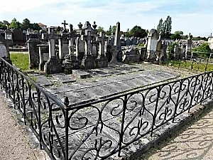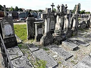 Deutsche Kriegsgräberstätte des Krieges 1870/71 auf dem Friedhof Faubourg. Aufrecht stehende Kreuze für Offiziere auf der einen Seite und flach liegende Namenssteine für Mannschaften auf dem größten Teil der Fläche.