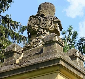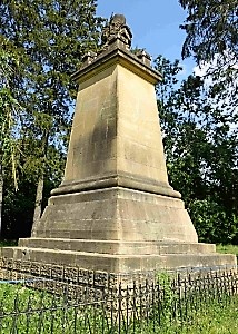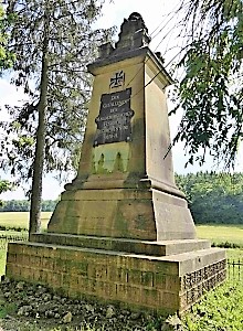Denkmal für die Gefallenen des Füsilier Regiments Nr. 36 beim Gehöft Chentrenne. Abgestuftes wuchtiges Sandsteindenkmal mit krönender Pickelhaube. Im eingezäunten Gelände eine einzelne Grabplatte.