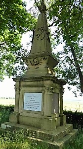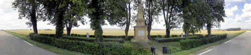 Vionville (Infanterie Regimenter Nr. 24 u. 64, 1870/71), Département Moselle, FrankreichPLZ 57130 Ehrenhain an der Strasse zwischen Tronville und Vionville. Die gepflegte Anlage liegt direkt auf dem ehemaligen Schlachtfeld vom 16.8.1870. Aus der umgebenden Hecke wachsen regelmässig gepflanzte Bäume, den Eingang bilden zwei eingegrabene Kanonen, Mündung nach oben. Links und rechts des Ehrenmals aus gelbem Sandstein, zu dem ein gepflasterter Weg führt, zwei längliche Grabbetten mit Steinkreuz (Aufschrift: 1870-71). Ehrenmal: Quader mit Ecksäulen, darauf Sarg mit Ehrenkranz, darauf Obelisk mit frontseitig Abbildung eines Infanteriehelmes, gekrönt mit steinerner Urne. Die ursprünglichen Namenstafeln und die vier Adlerfiguren auf jeder Ecke des Quaders sind verschwunden.