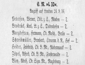 Verlustlisten der Kaiserlichen Marine Auf der vierten Angriffsfahrt am 24. September 1916 von britischem Abfangjäger über London brennend abgeschossen.(Ergänzungen (kursiv) wurden der Datenbank des VdK entnommen. www.volksbund.de)