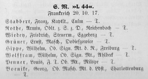 Verlustlisten der Kaiserlichen Marine Diverse nächtliche Erkundungsflüge über dem Rhein-Ruhrgebiet zur Überprüfung von Verdunkelungsmaßnahmen, Aufklärungsfahren und Angriffe auf England und britische Marineeinheiten. Am 20. Oktober 1917 auf dem Rückmarsch bei einem Sturm nach Frankreich abgetrieben und über Lunéville brennend abgeschossen.