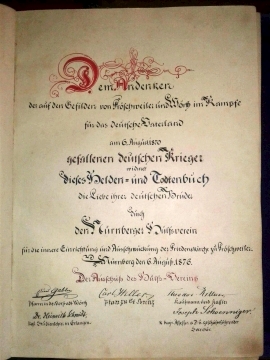 Dem Andenken der auf den Gefilden von Fröschweiler und Wörth im Kampfe für das deutsche Vaterland am 6.August1870 gefallenen deutschen Krieger widmet dieses Helden- und Todtenbuch die Liebe ihrer deutschen Brüder durch den Nürnberger Hülfsverein für die innere Einrichtung und Auschmückung der Friedenskirche zu Fröschweiler. Nürnberg den 6.August 1876 Der Ausschuß des Hülfs-Vereins