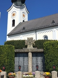Marmorpanele eingefasst mit Stein, darauf ist ein Kreuz aus Stein mit der Inschrift. Direkt beim Friedhofseingang positioniert.