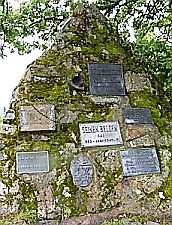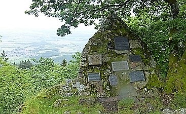 Jägerdenkmal auf dem Gipfel des Berges Hirzstein unterhalb des Hartmannsweilerkopfs. Pyramide aus Feldsteinen mit kleinen Täfelchen verschiedener Jäger- und anderer Einheiten, zu Ehren der Gefallenen der Kämpfe um den Hartmannsweilerkopf (Vogesen).