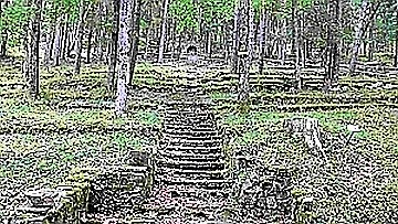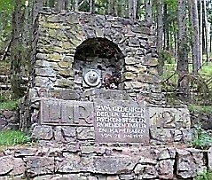 Wattwiller, Berg Hirzstein (ehemaliger Friedhof des L.I.R. 124, 1. Weltkrieg), Département Haut-Rhin, FrankreichPLZ 68700 Ehemalige Kriegsgräberstätte des Landwehr Infanterie Regiments Nr. 124 am Berg Hirzstein mit Opfern der Kämpfe um den Hartmannsweilerkopf. Die Bestattete wurden auf eine andere Kriegsgräberstätte umgebettet, aber die Terrassen der Gräber, der Treppenaufgang und das Natursteindenkmal oben sind erhalten.