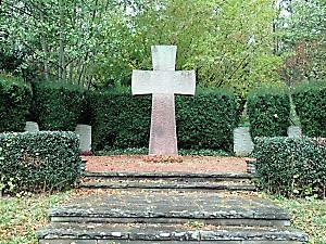 Ein großes rötliches Sandsteinkreuz steht mittig oberhalb des Friedhofes