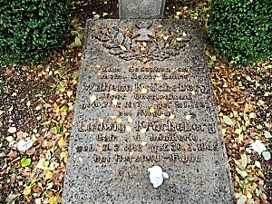 Gedenkstein auf Familiengrab mit Soldatenkreuz und Eichenlaub