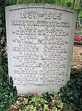 Hecke. Um das Kreuz im Halbkreis herum nahe der Hecke stehen mehrere Gedenksteine mit