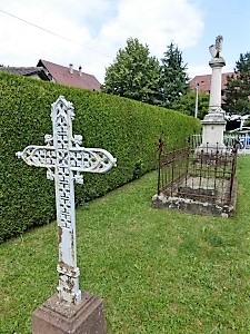 Neben dem Denkmal sind zwei Gräber erkennbar. An einem Metallkreuz ist ein Name ohne Daten angebracht. Das andere Grab hat eine schräge Grabplatte die leider nicht lesbar ist. Zusätzliche Informationen in Blau vom Volksbund Deutsche Kriegsgräberfürsorge: www.volksbund.de/graebersuche