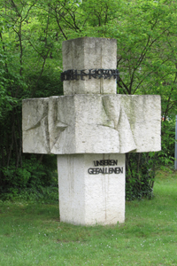 Steindenkmal ohne Namen in Kreuzform vor der Kirche.