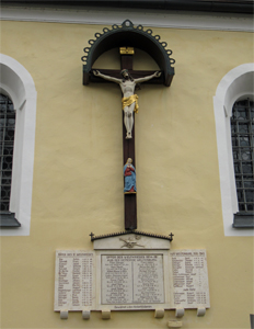 Gedenktafeln zu beiden Seiten des Gekreuzigten an der Kirche in der Ortsmitte sowie Einzelgedenken von Privatgräbern.