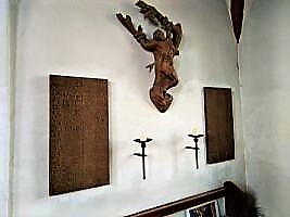 Kath. Filialkirche St. Willibrord in Elcherath: Holztafeln im linken Seitenschiff gegenüber vom Marienaltar; unten an der linken Tafel ein Eisernes Kreuz, rechts und links davon je zwei Eichenblätter; zwischen den Tafeln einarmige Kerzenleuchter aus Metall, oberhalb eine St. Sebastian-Holzfigur