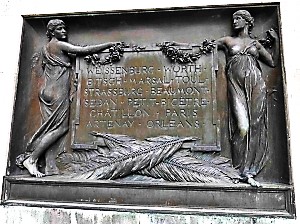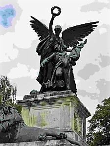 Großes Denkmal für die im Kriege 1870/71 gefallenen bayerischen Soldaten. Hausförmiger Unterbau mit den eingelassenen Bronzetafeln der Schlachtorte (mit flankierenden Siegesgöttinnen). Darauf ein ruhender Löwe und Podest mit krönender Bavaria mit Siegerkranz, einen fallenden Soldaten mit Fahne haltend.