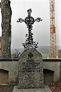 Im Friedhof; auf einem Steinsockel schmiedeeisernes Kreuz (ohne Namen), zusätzlich Hinweise zu Soldaten von privaten Gedenksteinen