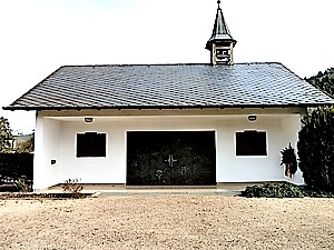 Auf dem Friedhof hinter der Kirche die Friedhofskapelle; hier sind links und rechts Eingangs