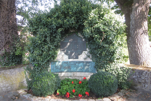 Die Gedenktafel für den 1. Weltkrieg hat die Form eines Kreuzes, die Ecken sind mit Eichenlaub geschmückt. Darunter wurden die Tafeln für den 2. Weltkrieg angebracht.
