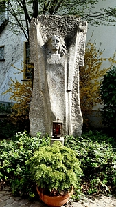 Bachem, Bad Neuenahr-Ahrweiler, Landkreis Ahrweiler, Rheinland PfalzPLZ 53474 Neben der St. Anna-Kapelle Denkmal für die Gefallenen beider Weltkriege. Die Anlage bildet ein behauener Stein aus dem ein Relief herausgearbeitet ist welches Jesus am Kreuz zeigen könnte. Beide Arme sind nach oben gestreckt, von der rechten Hand sind zwei Finger ebenfalls nach oben gestreckt, die linke Hand zeigt die Innenseite. Der Stein zieht bis zur Brusthöhe etwas ein, ab hier auf beiden Seiten ein rechtwinkeliger Knick, so das der Eindruck entsteht es handelte sich um ein angedeutetes Kreuz jedoch ohne oberen Abschluss. Links unten am Stein nur die Jahreszahlen 1914-18 und 1939-45. Die Kriegstoten von Bachem werden zusammen mit Ahrweiler genannt.