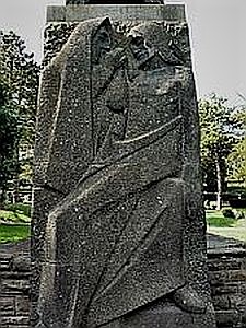 Pietá. Platten und Skulptur bestehen aus Basaltlava. Auf dem Friedhof eine