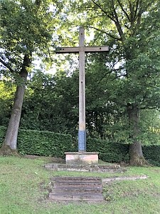 Hochaufragendes Holzkreuz. Davor schlichter Altar aus Bruchsandstein mit Inschrift. Das Kreuz wurde im Juni 1949 (Erneuerung 1999) errichtet im Namen der katholischen und evangelischen Kirchengemeinde.