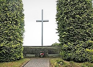 In einer Mauer eingefügt zwei Steinplatten. Auf der Mauer ein großes Kreuz.