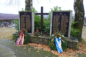 Das Ehrenmal befindet sich auf dem örtlichen Friedhof. Beiderseits eines Hochkreuzes stehen