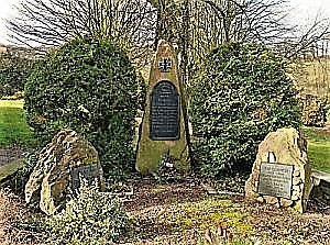 Drei Steinfindlinge, mit jeweils einer Gedenkplatte