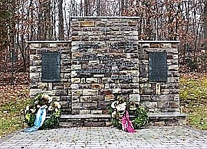 Steinwand aus bearbeiteten Steinen. In der Mitte Inschrift links und rechts Gedenkplatten